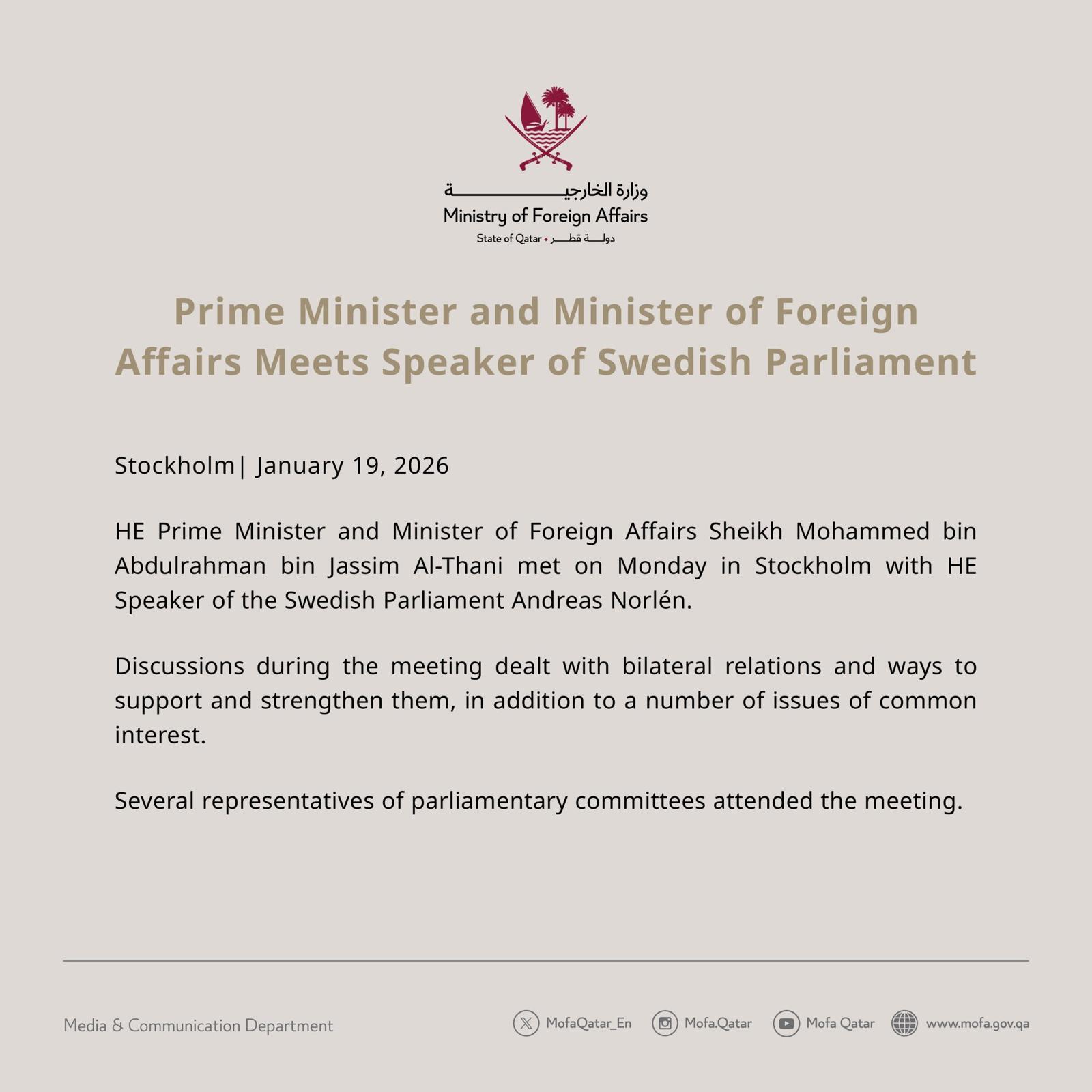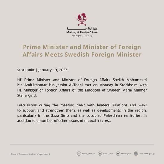 The visit included meetings with several senior Swedish officials, during which the two sides discussed ways of cooperation between the two countries, especially in the field of development as well as joint efforts in the areas of security, peace and humanitarian aid, and ways to enhance cooperation between relevant Qatari institutions and the Swedish Institute of International Affairs.